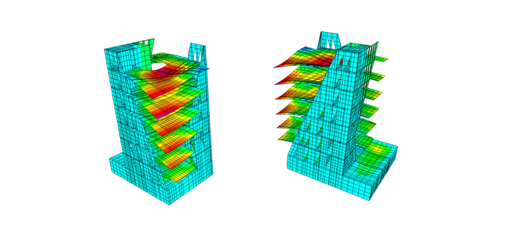 Λόγω της ιδιαίτερης αρχιτεκτονικής του κτηρίου (κεκλιμένα τοιχεία με οπές και  μεταλλικά υποστυλώματα στις όψεις),η ανάλυση της σύμμικτης κατασκευής έγινε με πεπερασμένα & ραβδωτά στοιχεία και η διαστασιολόγησή του σύμφωνα με τις διατάξεις των Ευρωκωδίκων. Για την διευκόλυνση της κατασκευής, παρήχθησαν αναλυτικά σχέδια όψεων και λεπτομερειών συνδέσεων των μεταλλικών μελών στα μέλη από Ω.Σ.